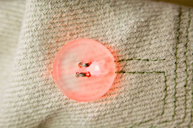 Cuando el agarre, es hora de empezar a coser los botones juntos. PRECAUCIÓN: al coser el botón + y -, asegúrese de no toquen, esto puede causar un corto. Con una pequeña aguja, cosa cada subproceso 3 veces, asegurándose de que hay una firme conexión con las patas del LED. Hacer lo mismo con el pushputtons, colocada en cada brazo. En la parte superior los botones simplemente he cosido un botón en la parte superior, para que se vea mejor y lo que es un botón más grande. Así como atar un nudo para sujetar el botón, utilice un hierro de soldadura para fundir el hilo de la final a su uno mismo. Esto reduce el riesgo de los dos hilos tocando y creando un corto!