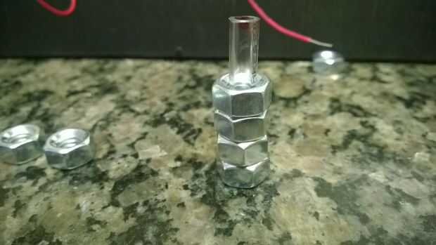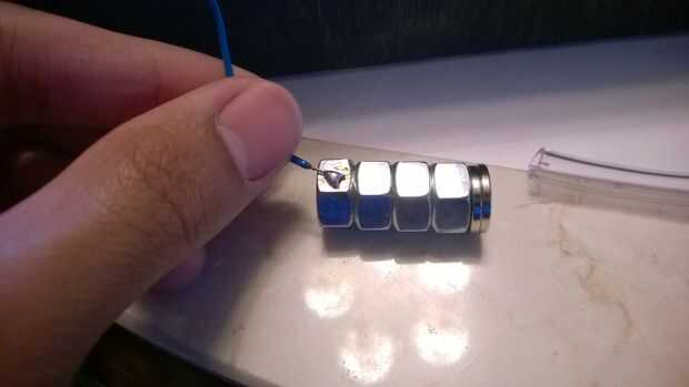 Luego coloque la tuerca soldada en la pila magnética. No importa muy mucho, a menos que están luchando por conseguir la pila para mover la forma desea que: a veces es mejor en la parte inferior, otras veces me pareció mejor para arriba cerca del imán. Usted quiere el imán para llegar a tocar el cobre cuando el soporte es por encima de él, pero retroceder hacia abajo en posición cuando se quita el soporte.