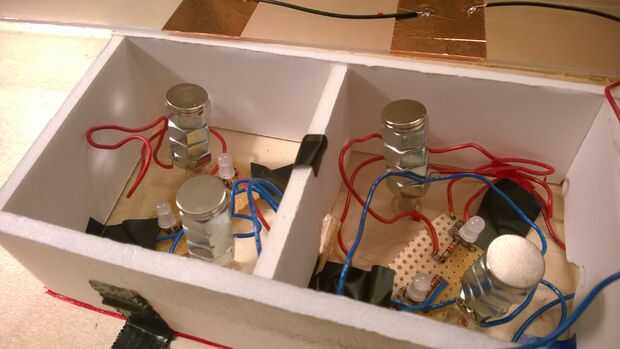 Aquí es donde recortar placas de circuito impreso va a venir bien. Cortar 1 1/4" piezas de tubo, bastante para dejar una brecha entre ésta y la pieza de plexiglás estrecha por encima de él. Éstos apoyan las pilas de imán y les que se mueva alrededor de demasiado. Organizar cada espacio para que la placa de circuito es diagonal y pegamento las piezas de tubo en lugar. Ser cuidado de no ponerlas demasiado cerca entre sí o el imán apilados serán atraídos uno al otro y no demasiado lejos aparte que el imán no toque la cinta de cobre por encima de él cuando el soporte plástico se coloca por encima de él.