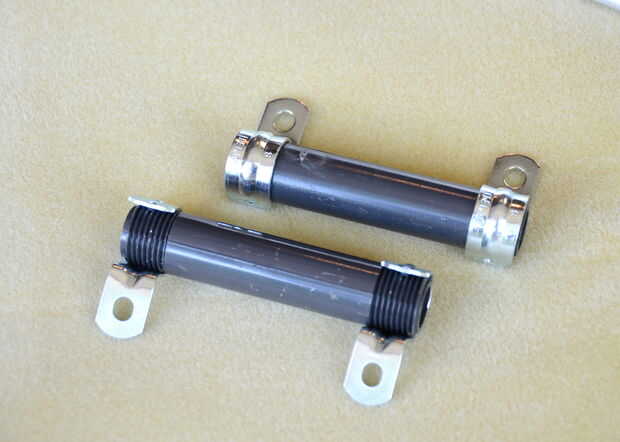 b. a continuación, ligeramente curva las suspensiones de conducto cerradas hasta formar un apretado ajuste alrededor de los extremos de la canalización vertical de PVC (segunda foto). Fije los ganchos de conducto (con las tabicas insertadas) en la parte inferior de la placa con los ¼ "x ½" pernos y las tuercas de fijación. La distancia entre los centros del tubo debe ser 3 ¼". Si la distancia es un poco diferente, asegúrese de hacer el ajuste apropiado cuando taladre los orificios en el paso 4b.