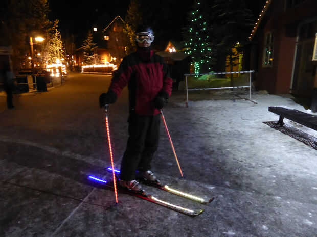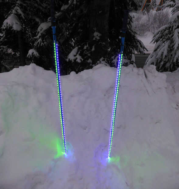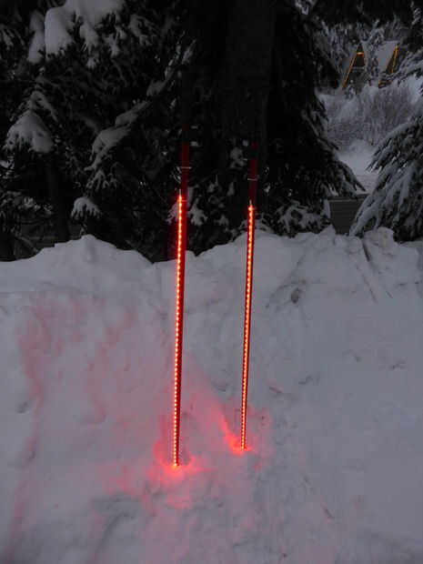 Esta es una ruta mucho más fácil para hacer bastones de esquí de luz-para arriba. Pueden no ser tan brillantes como mis postes de primera generación pero son mucho más fácil y más robusta. Afortunadamente, es tan sencillo como ordenar algunas autas-adhesivas, impermeables emisión de lado tiras de LED de Glowhut.com y adjuntarlos. Vienen en muchos colores y funcionan con una batería de 9 voltios.