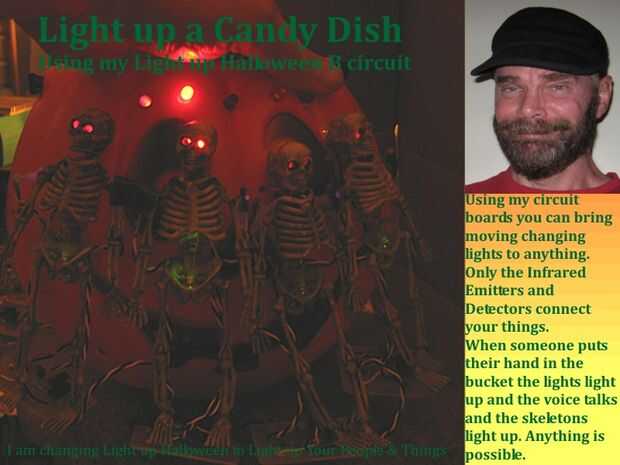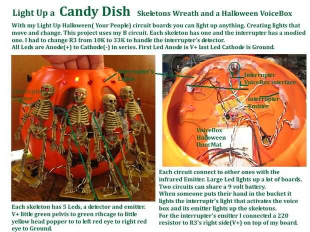 En este proyecto utilizo un circuito B para ejecutar el interruptor y el emisor se utiliza para iluminar los esqueletos. El objetivo del emisor en el detector del esqueleto de la primera. Encienda los transmisores y de todos los esqueletos que iluminan. Apague el transmisor de sólo de circuito de interruptor de B y apagan las luces. Mediante la combinación de otros circuitos puede crear arte de movimiento. Sólo apuntar los emisores en los detectores y mover las luces.