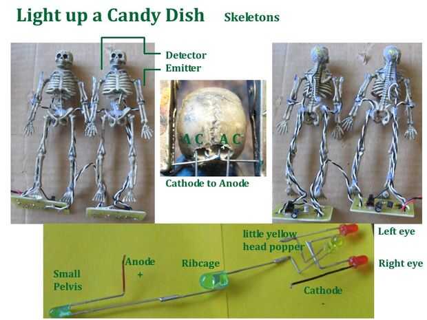 Cada esqueleto tiene mi B circuito con emisor y detector y 5 Leds. Taladré un agujero a través de cada ojo de todo el camino a través del cráneo demasiado pequeño para los Leds. De la parte posterior del cráneo que ésos los orificios perforados hacia fuera para adaptarse fácilmente a los leds, pero no hasta el final. Esto detiene los Leds en un buen lugar. Pegarlos en su lugar. Dos pequeños LED ' s rojos para los ojos. Un pequeño Led amarillo detrás de la cabeza al pop de fondo. Un normal tamaño Led verde dentro de la caja torácica. Un pequeño Led verde dentro de la pelvis. Todos los Leds están conectados el cátodo al ánodo. V + a pelvis verde pequeño ánodo a parrilla costal verde amarillo poco atrás de la cabeza a izquierda ojo rojo para el ojo derecho rojo cátodo a tierra. El detector está en el hombro derecho y el transmisor está en el hombro izquierdo. Pegarlos en con suficiente cable para apuntar a los vez que están instalados.