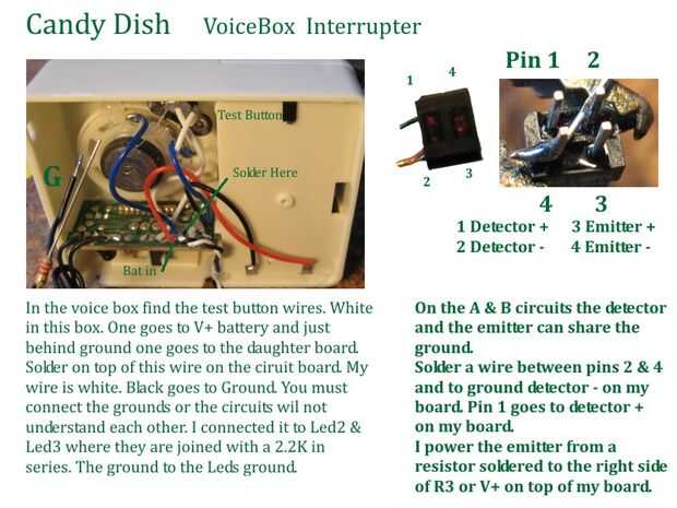 La estera de puerta de caja de la voz de Halloween que encontré en mi RiteAid en Hollywood interconectar con mi circuito usando el LED como un divisor de tensión para el botón de prueba. En placa de circuito de la caja de la voz encuentra el interruptor de prueba que tiene dos cables. Un cable a V + 3 voltios y el otro al lado del contacto con el suelo a la Junta de la hija. Soldar el cable en la parte superior este cable. Interfaz entre circuitos debe conectar los motivos o no se entienden entre sí. Siempre poner un resistor en serie con la conexión. Mi circuito es de 9 voltios y la caja de voz es de 3 voltios. Usé el punto entre 2 Led & Led 3 y 2,2 K resistencia en serie.