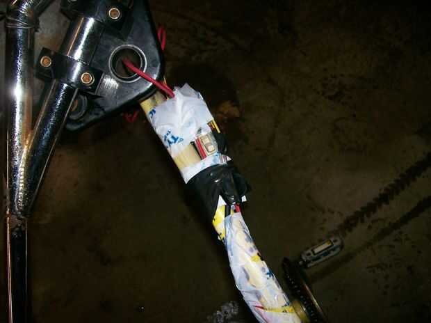 ok ahora ejecutar el cable positave de usted la batería a la cinta de luz en la bicicleta donde needed.tape el cable a la batería para que no caiga (también la cabeza claro) luego ejecutar el cable de negitave de la batería al interruptor y luego a la cabeza light.wait a la noche y luego ir a probarlo!