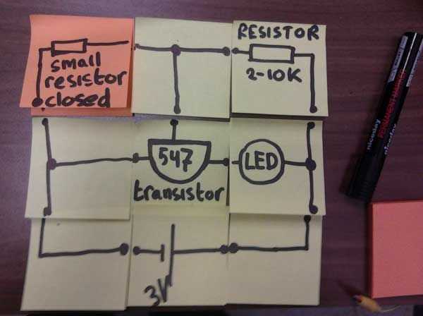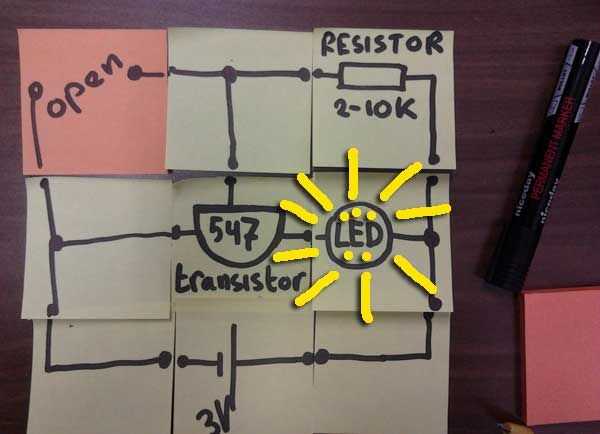 Luego la base se puede hacer negativa por el cierre de los dos cables a la izquierda. Y cuando no se cierra, la base es positiva, a través del resistor en el lado derecho, y el LED está encendido, porque la corriente puede fluir a través del transistor.