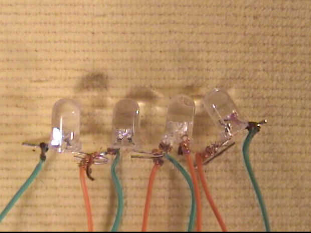 3. ahora después de tomar el LED Haz 8 cables finos de 15cm y conecta cada LED en paralelo, conecté los cables verdes con el terminal y la naranja - terminal!