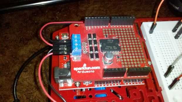 Protector de conductor del motor el Ardumoto naves sin encabezados o terminal instalado. En lugar de la soldadura, luego simplemente enchufe en el Arduino. Una vez que el conductor del motor está conectado a Arduino, conectar los motores a los bornes del motor. Si más tarde, descubre que los motores gire la dirección equivocada, sólo invierta los cables para ese motor.