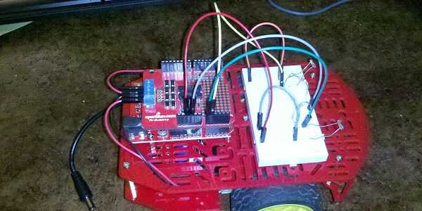 6. Ate al cruce de la fotorresistencia izquierdo y la resistencia de ohmios k 4.7 para el (0) analógica en el pin de la Ardumoto.