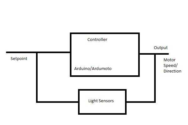 En este bucle de control muy simple, el punto de referencia es igual a cero (donde ambos sensor de luz están leyendo el mismo valor). La salida es la velocidad del motor y la dirección.