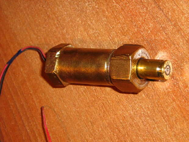 cortar la base grande del tubo más fino manteniendo los peldaños y la tuerca, luego usé la mitad de una "bala" como presione el interruptor eléctrico a continuación hace una pieza de madera que le entra la bala pero tiene una sección que irá encima de la