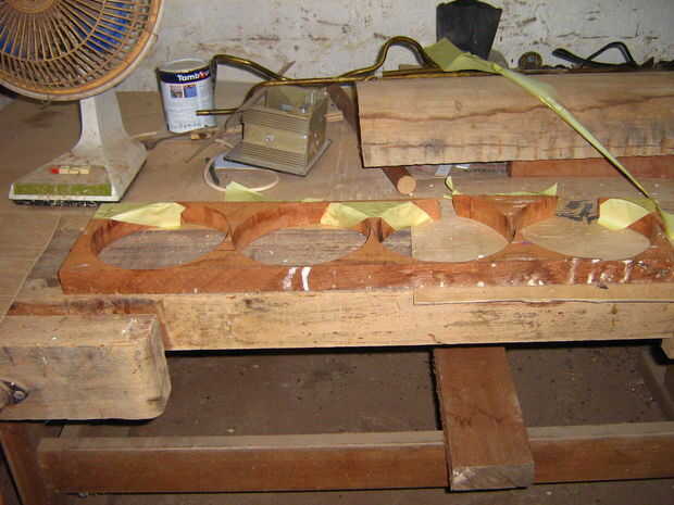 Las piezas de madera. 1.la base principal. Tenía una muy bonita pieza de caoba 850x200x40mm y por lo tanto decidió hacer 4