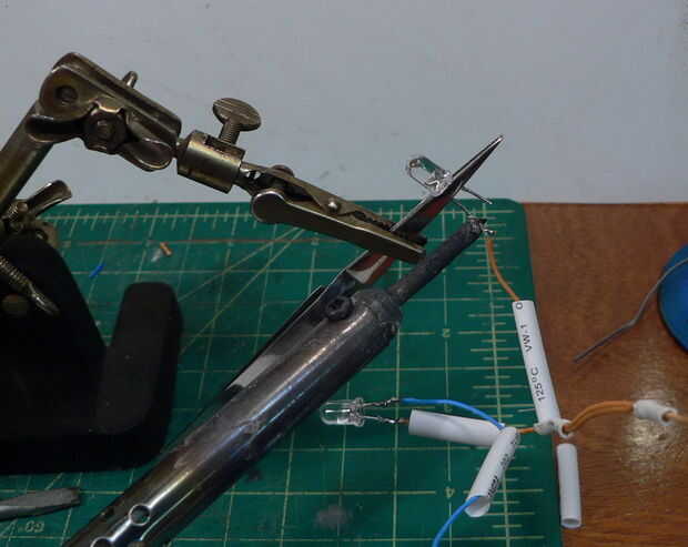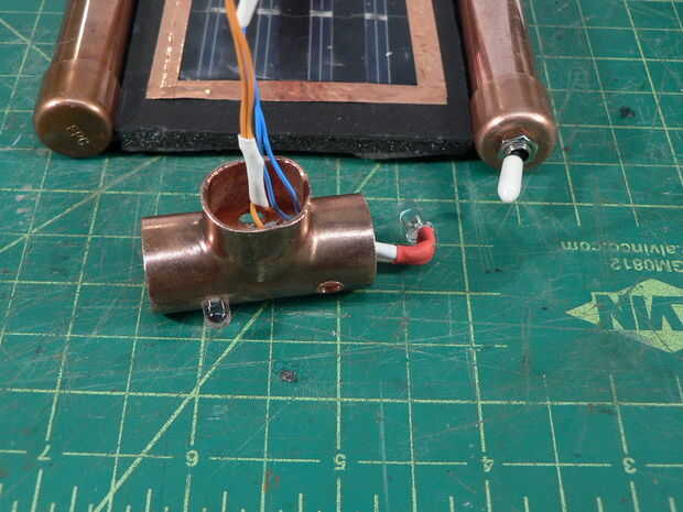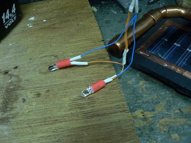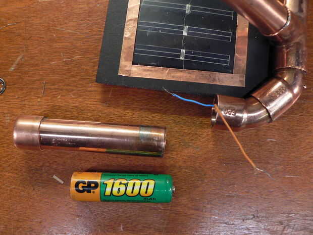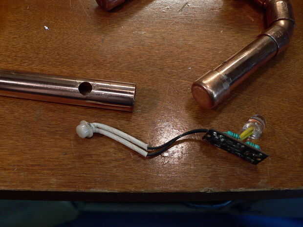 Hubo varios más piezas para encajar en los tubos de cobre como el PCB (circuito impreso), el LDR (resistor dependiente de luz), batería, interruptor y LED. Necesitaba algunos jugando hasta que encontré el derecho de colocación (discreta). Me aseguré que todos los cables pelados eran cubiertos por cinta aislante o tubería del encogimiento.