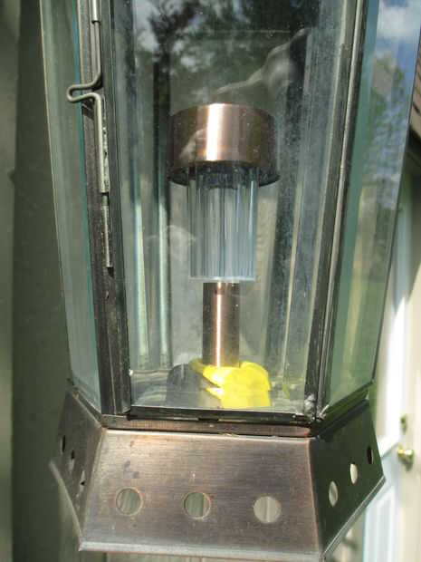 Además de estas luces de jar tengo yarda 3 linternas. De vez en cuando le tiro una vela de citronela en estas para dar un ambiente a la yarda. Con un simple corte de los picos de los ensamblajes de luz he instalado luces en los faroles. Cortar las puntas a cerca de 4 pulgadas para permitir la luz del sol cargar la batería solar.