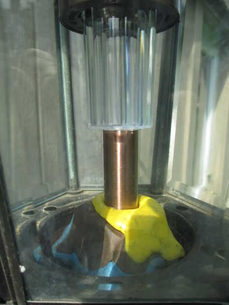 El problema que tuve fue como montar la espiga dentro de la linterna. Al principio que pensé que podría funcionar un pegote grande de pegamento caliente. Que idea falló rápidamente como el pegamento no adherirse al fondo de metal pátina. Solución... gran bola de arcilla de moldeo mi hijo tenía puesta alrededor que él compró en la tienda local del dólar.