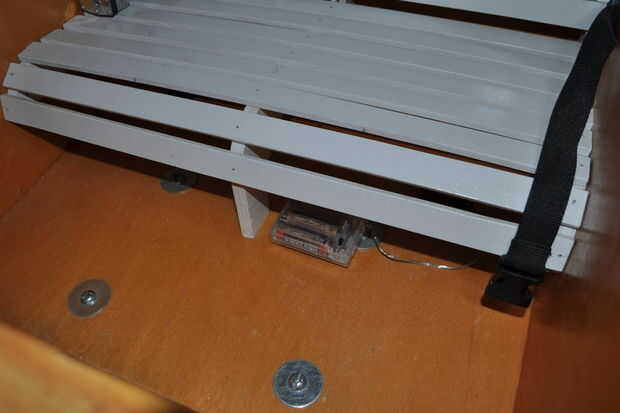 Un par de días más tarde volví a él y trató de lijado el alambre para obtener el mejor contacto. Para mi sorpresa en ese alambre fino es el alambre de cobre muy fino. Fue trabajando así que soldar los cables juntos y funcionaron el cable de la manija en el suelo y dentro de la caja. Usé velcro para montar la caja de la batería debajo del asiento para que fácilmente pude quitarlo para reemplazo de la batería.