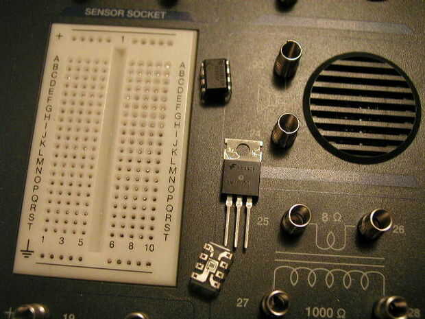 1. radioshack TSL230 convertidor de luz a frecuencia 2. el CI TLC555 3. sin soldadura Breadboard 4. cable de conexión sólida (para la placa) 5. batería PP3 de 9V 6. regulador de tensión fijo de 5V 7. el pequeño Altavoz 8. pinzas de batería de 9V