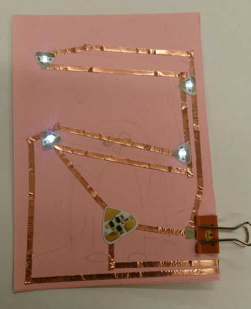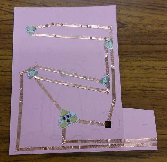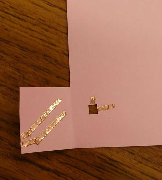 Habiendo diseñado el circuito empecé a pegar abajo, primero asegurándose de que no se rompa la cinta de la cinta de cobre - todas las esquinas se doblan (esto es importante, algunas personas romper la cinta y la conexión resultante era pobre *, así que mantenerlo como una sola pieza en lo posible). Las pegatinas de LED y efectos fueron en la parte superior.