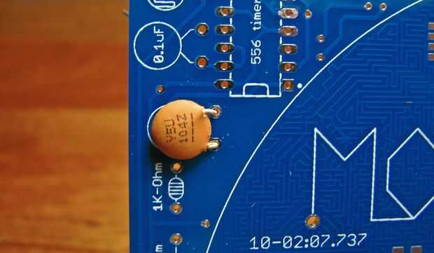 Vamos a comenzar, colocando uno de los componentes más fáciles para trabajar con: un condensador. Busque la ubicación donde se colocará mirando las marcas de serigrafía blanca sobre el "lado de componentes" de la placa de circuito. Encontrar una de las dos marcas de serigrafía que coincide con la forma del condensador y tiene su valor de 0.1mF marcada sobre la misma. Empuje los cables del condensador a través de los orificios en el tablero y tire a través desde el lado opuesto para que el condensador sienta tan cerca de la Junta como sea posible. Doble condensador abajo de plano contra el tablero, directamente encima de su imagen. Voltee la placa de circuito para que los conductores se están pegando para arriba. Este es el "lado de la soldadura" de la Junta. Doble la lleva aparte para que el componente no puede moverse o deslizarse hacia atrás por los agujeros.