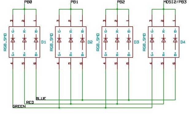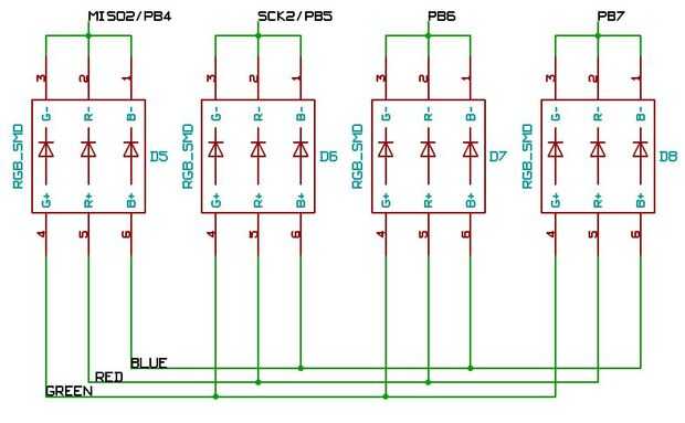 3 pines GPIO con 3 resistencias de limitación actuales se utilizan para suministrar corriente a todos 8 ánodos de un solo color. LEDs individuales son activar o desactivar usando 8 pines GPIO para conducir los cátodos. Dependiendo del tipo de operación de los LEDs son ambos multiplexado (PWM para más colores) o totalmente (mayor brillo).
