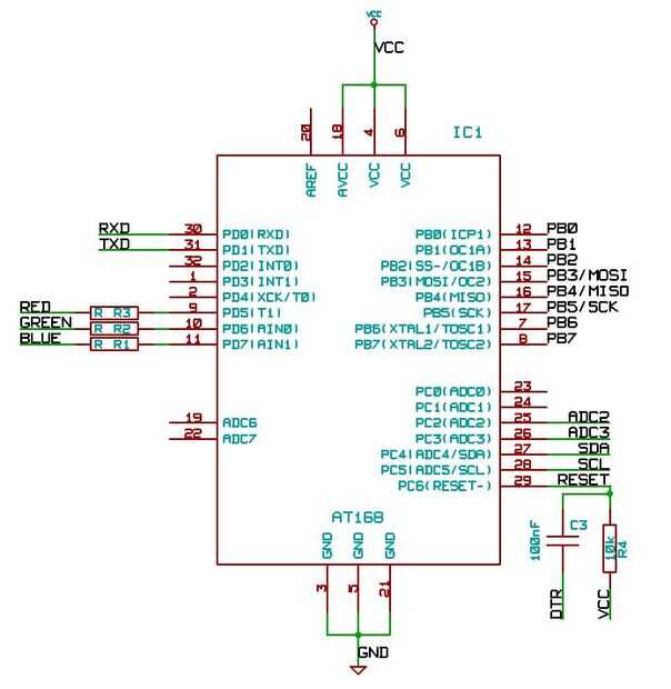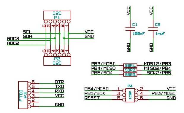 En el esquema sólo encontrarás la cpu, los LEDs, unas resistencias y condensadores. Eso es todo. También hay unos pocos encabezados. Los tableros tienen un encabezado ICSP para flashear un gestor de arranque y una cabecera de 6 pines para conveniente subir serial. Las 2 últimas cabeceras se reflejan y contienen energía, I2C y dos pines GPIO/ADC más.