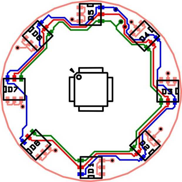 En modo PWM, el color se establece mediante la aplicación de una señal modulada de ancho de pulso el los pines GPIO 3 y los 8 LEDs de la multiplexación. Esto reduce el brillo total, pero ahora es posible el control del color individual. Esto se hace en el fondo por una rutina de interrupción. Funciones básicas están disponibles para ajustar los LEDs un determinado valor color, ya sea mediante un triplete RGB o un valor de HUE.