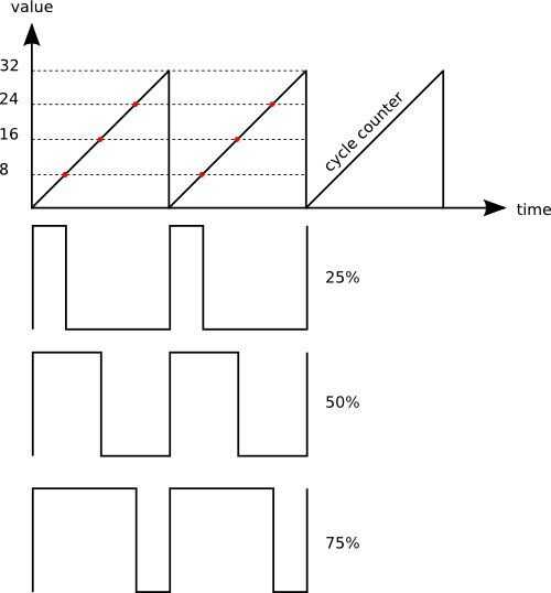 La segunda figura ilustra la generación de PWM. Un contador de hardware cuenta de abajo hacia arriba. Una vez que el contador es mayor que un cierto número que representa un color deseado, se activa la salida. Una vez que el contador ha alcanzado su valor superior, todo se restablece. El aparente brillo del LED es algo proporcional a la hora de la señal. Estrictamente hablando, eso es mentira, pero más fácil de entender.