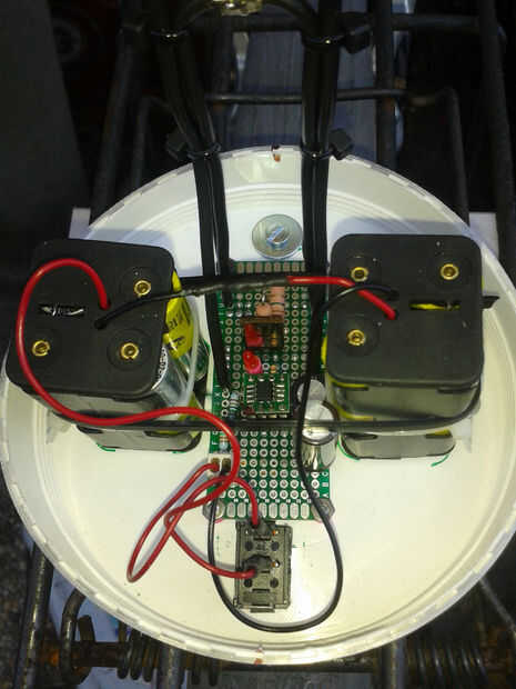 Cuando la electrónica y la programación estén listos, puede Asamblea la luz. Yo uso tornillos M3 para fijar las baterías y la electrónica en la parte inferior de la tapa del tazón de fuente. Para alcanzar la máxima visibilidad de que los leds son soldados un armazón de alambre de cobre a la luz desde el centro del tazón de fuente.