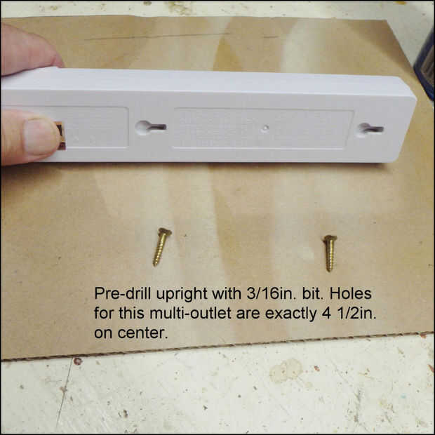Marca donde se perforarán los orificios; Este tomacorriente múltiple tiene agujeros 4,5 pulgadas aparte, en el centro. Taladre los agujeros para tornillos para mantener la salida en el montante. Ataduras de cables también puede ser utilizado y parece que funciona igual de bien.