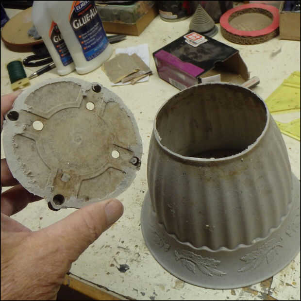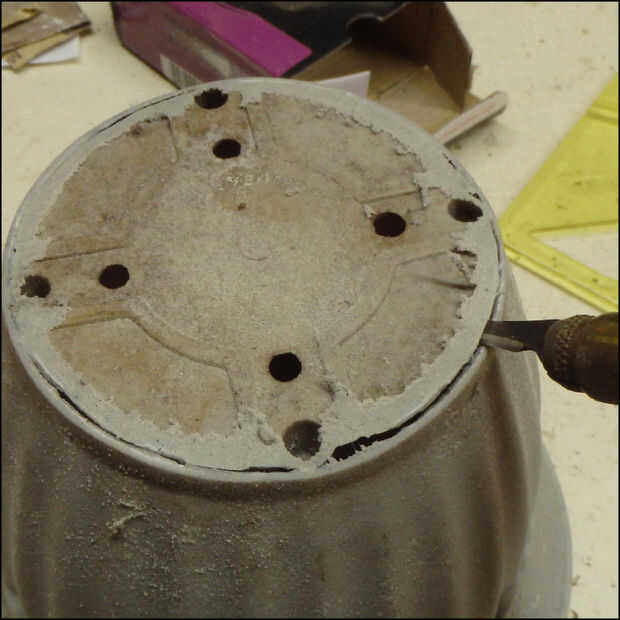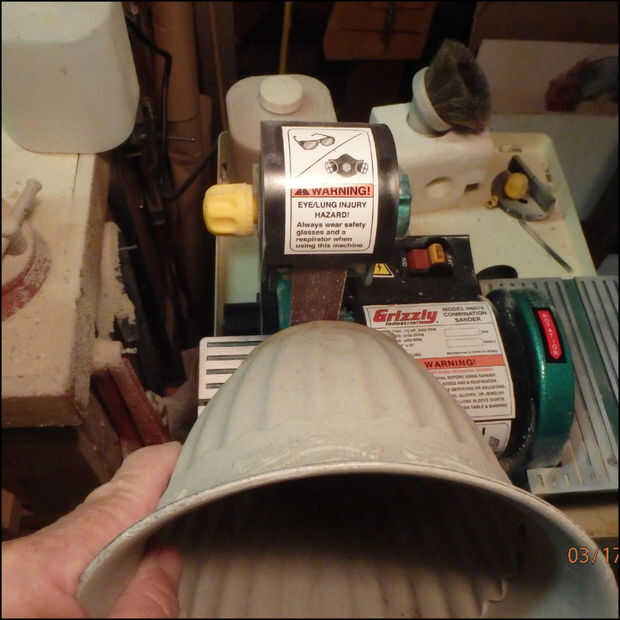 Que asumió la maceta a la lijadora de banda de 1 pulgada y arena alrededor del perímetro hasta que pude ver que había ido a través de todo el camino. Luego, se utiliza un cuchillo para cortar el plástico siempre que sea posible. Es rematado por lijado más donde se puede quitar de la olla es necesario, entonces la parte inferior.