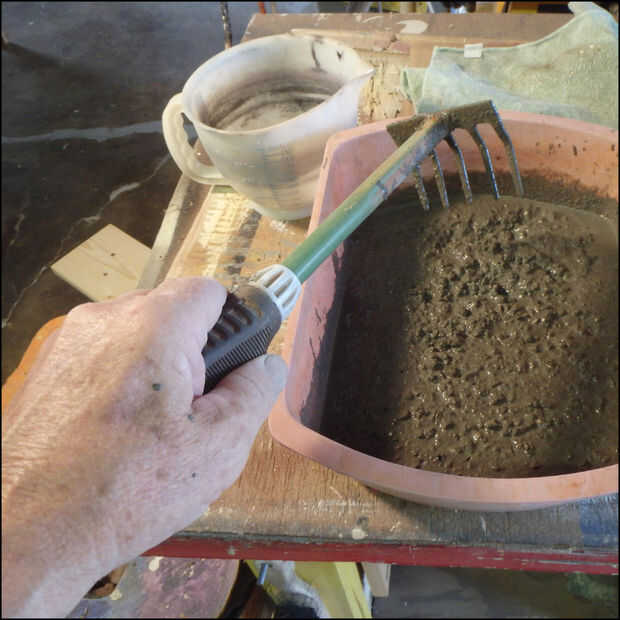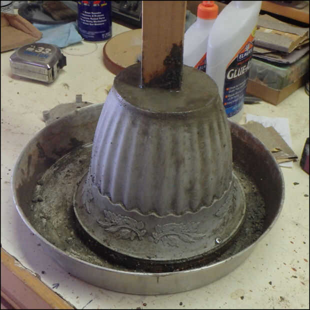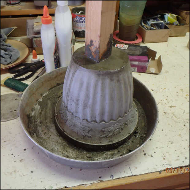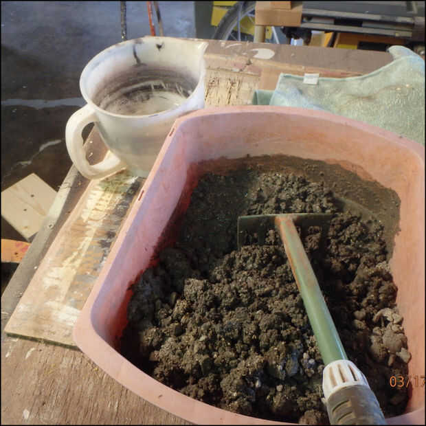 Ahora que el bote se fija a la base, se puede mezclar y vierte la mezcla de hormigón. He utilizado la mezcla de muestra y para este proyecto, se necesitan unos 7 latas de 14,5 onzas de mezcla seca. A esta mezcla en la bañera he añadido aproximadamente dos tazas de agua limpia. Quiero una mezcla bastante fluida, uno que sea fácil de colocar en el pequeño orificio de la maceta. Obviamente, estas medidas pueden variar para tu configuración dependiendo del tamaño de la olla, la humedad y otras variables.