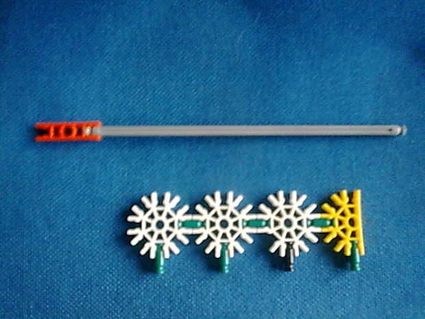 esta es un arma de KVG que usted puede hacer si no tienes muchas piezasPaso 1: Reunir las piezas para hacer el arma que vas a necesitarmango2 conectores verdes2 barras verdesbarra azul 14 conectores de púrpuraCañón3 barras rojas2 barras amarillas2 ba