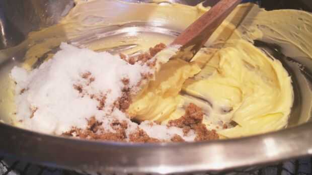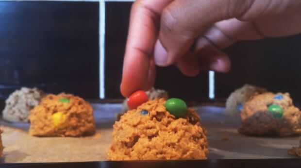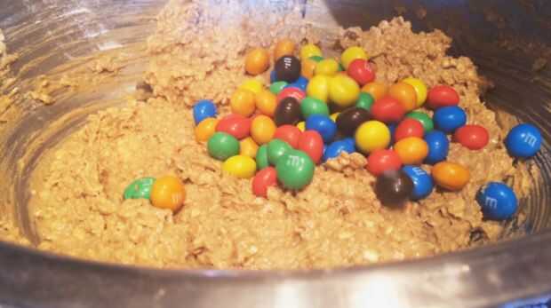 Crema de la mantequilla y el azúcar hasta ligero y mullido. Añadir el huevo seguido de la vainilla, canela, bicarbonato, soda y sal. A continuación añadimos el la harina, la avena y la mezcla hasta que se forma la masa de galletas. Para terminar, agregue los M & M y dejar para enfriar en la nevera durante 30 minutos.