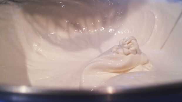 La pelusa de la melcocha, añadir la clara de huevo, jarabe, jugo de limón y sal en una batidora y bata hasta que se forman picos suaves. Añadir el azúcar glas y batir otra vez.