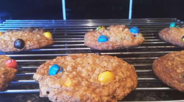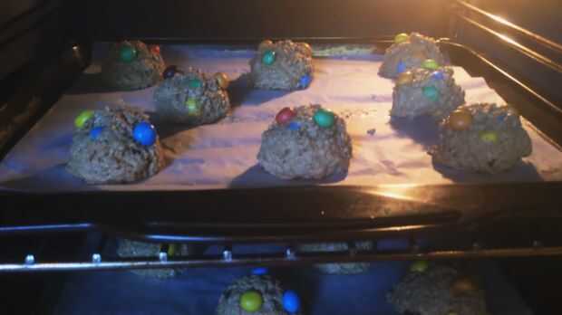 Usando una cuchara para helado, cuchara de la masa de galletas y coloque sobre una placa con papel parafinado. Añadir algunos extra M & M y hornear en un horno a 200 grados durante 10 minutos.