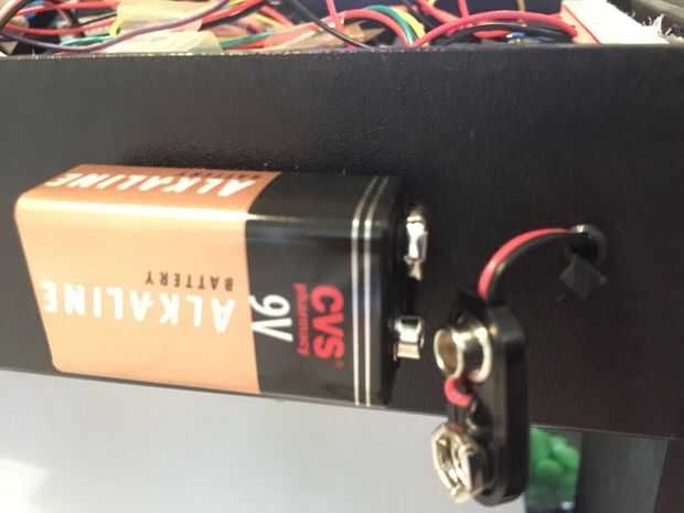 6. Coloque tiras de velcro en la parte posterior derecha del recinto, cerca del hoyo que fue perforado para los cables de la batería. Al otro lado del velcro debe sujetarse a la batería de 9V. Por los cables del adaptador de alimentación a través de este agujero, nos podemos fácilmente snap y desactivar el poder del proyecto, así como reemplazar la batería.