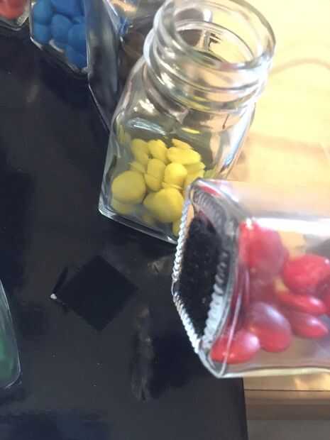 9. Monte de sal y pimienta coctelera (sin tapas) a lo largo de la cartulina. Mueva la parte de atrás y adelante y manualmente caída de M & Ms a través para encontrar los lugares adecuados para fijar los contenedores. Una vez que encuentre la ubicación adecuada. Velcro tanto el lugar de la cartulina y la parte inferior del envase. Una vez que usted cargue el código, tienes que hacer pequeños ajustes en la ubicación del servo con dado colores basados en donde pones los contenedores. ** Recuerde, usted todavía puede doblar el bronce que proporciona el ángulo de la diapositiva **