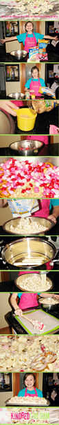 Verter el chocolate blanco sobre la mezcla de palomitas de maíz snack mix.
