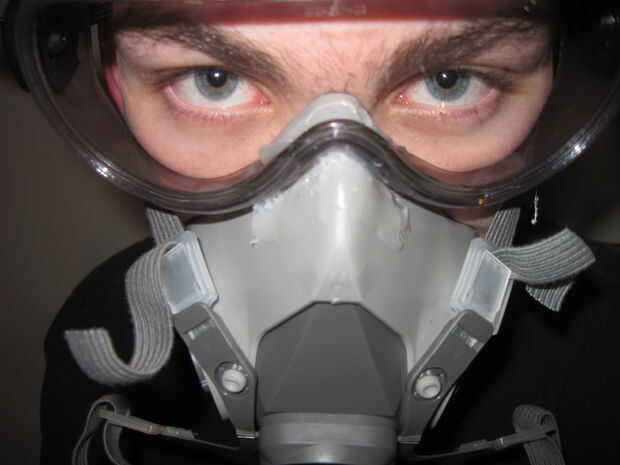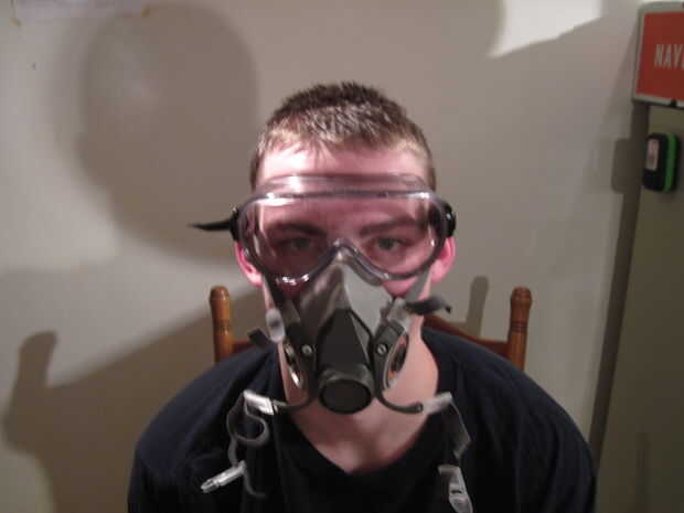 inspirados en algunos planes de 1942, hice mi propia máscara de gas de un tubo respirador, una poder de lata y algunos carbón a partir de cáscaras de coco. Funciona muy bien!. ¡ Había barnizado mi barco y no conseguir un dolor de cabeza!Yo no lo esto