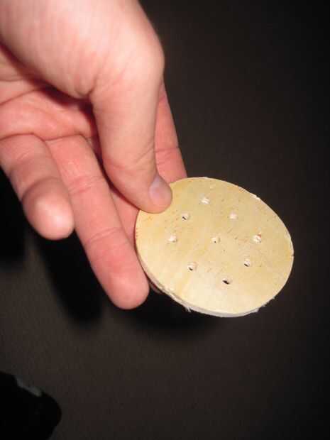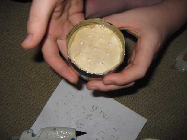 La primera parte es crear el marco para el filtro. No use la lata entera, así que tienes que cortar de la parte superior, dejando sólo la cuarta parte de la can (con la parte inferior fijada). Corte un pequeño agujero en la parte inferior de la lata. Después de que ha hecho esto tienes que construir una tapa para el filtro. Utilizamos madera porque era fuerte y podría ser lijada con el tamaño perfecto. Después de haber creado la parte superior y perforados agujeritos de aire en él, puede empezar a agregar las capas de filtro en el marco.