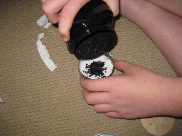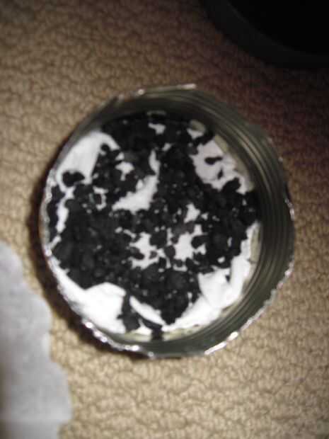 La primera capa que se agrega es una capa de paño grueso. Sólo cortar una camisa de lana vieja y dobla una tira. Luego se alternan capas de carbón de leña activado y tiras de filtro de café. Asegúrese de estirar uniformemente el carbón de leña y cubra completamente el filtro entero en cada capa. Después de unos dos o tres capas de carbón de terminan con otra capa de tela y caliente pegar la tapa en su lugar. Asegúrese de pegar la tapa firmemente, porque si las capas no se embalan firmemente el carbón de leña se ruede alrededor y caer al fondo del filtro.