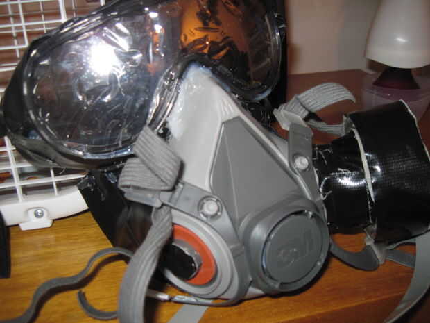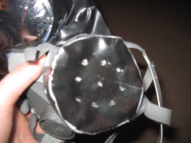 Una vez que ha conectado con éxito el agujero, puede hacer cualquier detalle final a la máscara. Como cubriendo la parte plana del filtro en cinta y perforar los agujeros en él. O cualquier ajuste final a las correas para que la máscara es hermética cuando usted lo usa.