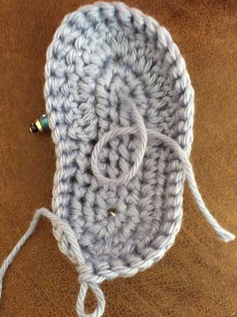 - RND 1-Ch1, 1 sc en la misma calle, pero sólo a través del lazo trasero. (Nota: continuar ganchillo sts en este rnd, sólo en el lazo posterior. Esto hace que es mirada como una suela de zapato) 1 sc alrededor de la planta del pie hasta el final. Hacer no un sl st en sc 1 de este rnd.