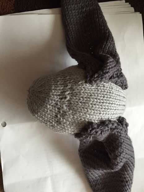 - Para colocar la oreja, me dobla la oreja por la mitad y cosido con la cola larga de la fundición en. 2 º foto de la derecha. La foto de la derecha es de las orejas a la cabeza. Les coloca 1 1/4" aparte en el centro de la cabeza y para mostrar el centro de la oreja, cosí ellos en con la oreja doblada hacia atrás abierta. Principalmente lo hice porque me gusta el lado punto más que el lado purled.