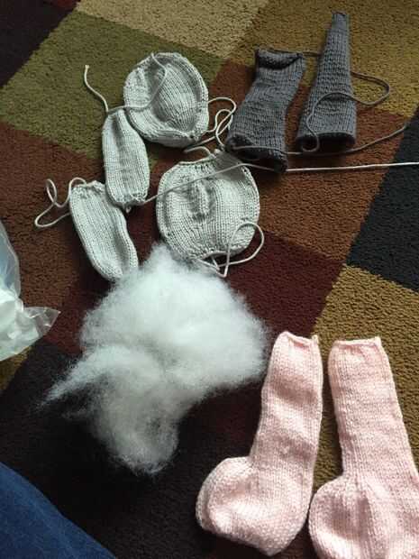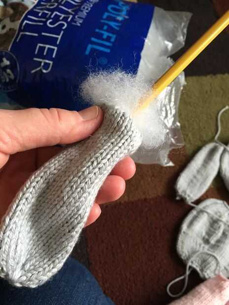 - Rellenar las piernas con el lápiz. El borrador ayudarán a los pies de relleno firmemente. Los pies resultados para ser más grande que pensé que sería. Cuando las piernas fueron rellenos, I había cosido las piernas para arriba y hasta la parte superior y había unido al cuerpo. Fila inferior, 3 º y 4 º foto de la derecha.