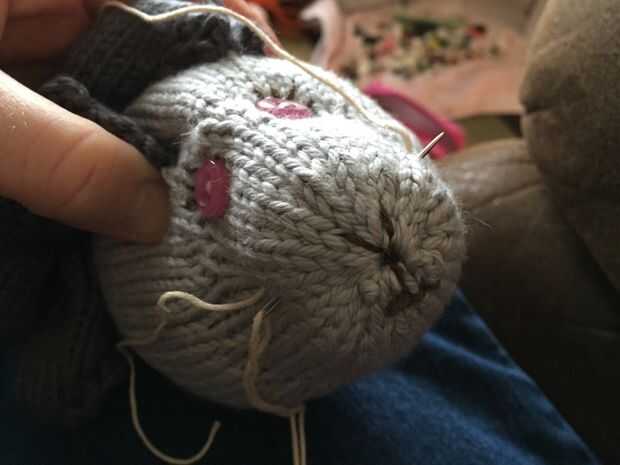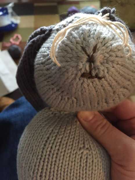 - Con la hilo marrón, hice un poco la nariz y boca, cose una Y forma y la línea recta en la parte frontal de la nariz. Fotos 2ª y 3ª de la derecha. Esto fue bastante fácil y no pasó mucho tiempo. He añadido los bigotes como una ocurrencia tardía. Después de pensar más, agarré el hilo marrón otra vez y dio las pestañas. Ella es una chica después de todo.