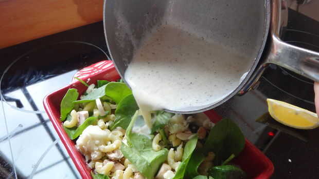 Vierta la leche especiada caliente sobre la mezcla de macarrones/veggie.