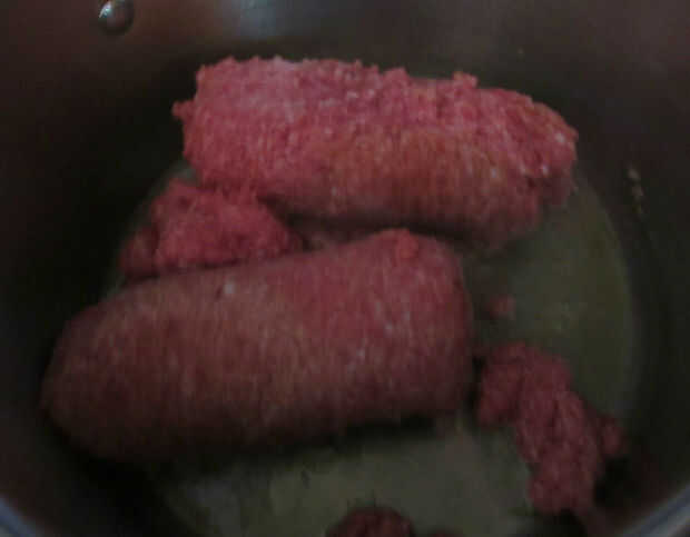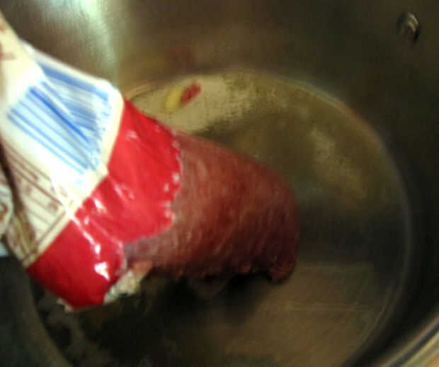 Coloque mantequilla en la olla. Sobre la olla, use el cuchillo para abrir pavo molido. Extraiga todo el contenido. Deseche la envoltura en una bolsa de plástico y la basura.