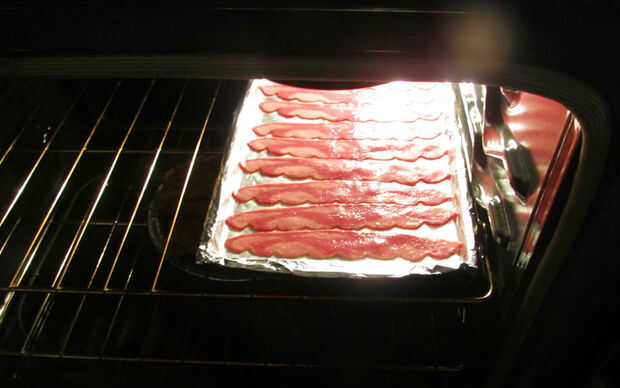 Revolver y agregar el caldo de pollo. En una placa para horno agregar tocino. Poner en el horno. Saltar si usando trozos de tocino. Cocinar hasta hervir, revuelva de vez en cuando.