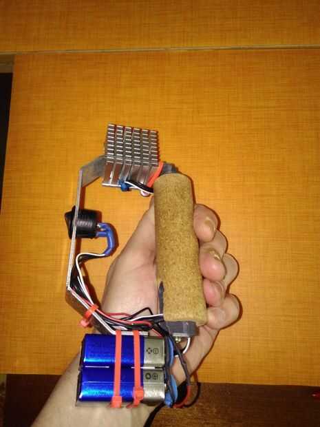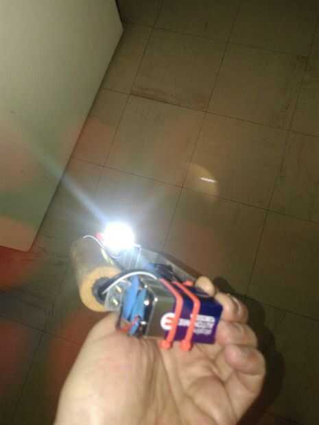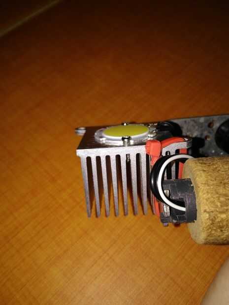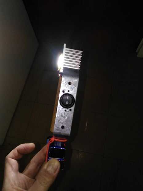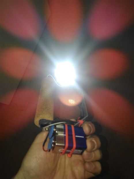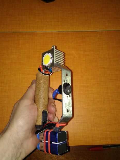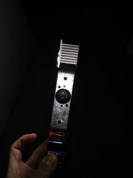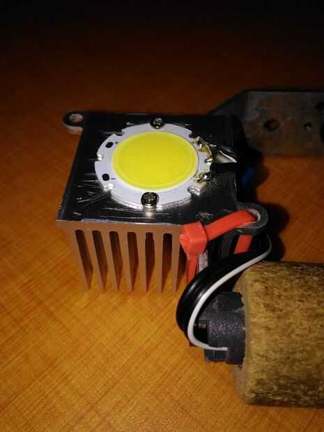 soldar dos cables en led y unirse a las baterías en serie (9 + 9 = 18 voltios), agregue el modificador y fijar el led en la base del radiador (no te preocupes, puedes tocar el led... las superficies es de baja temperatura), construir una lámpara cómo quieres...